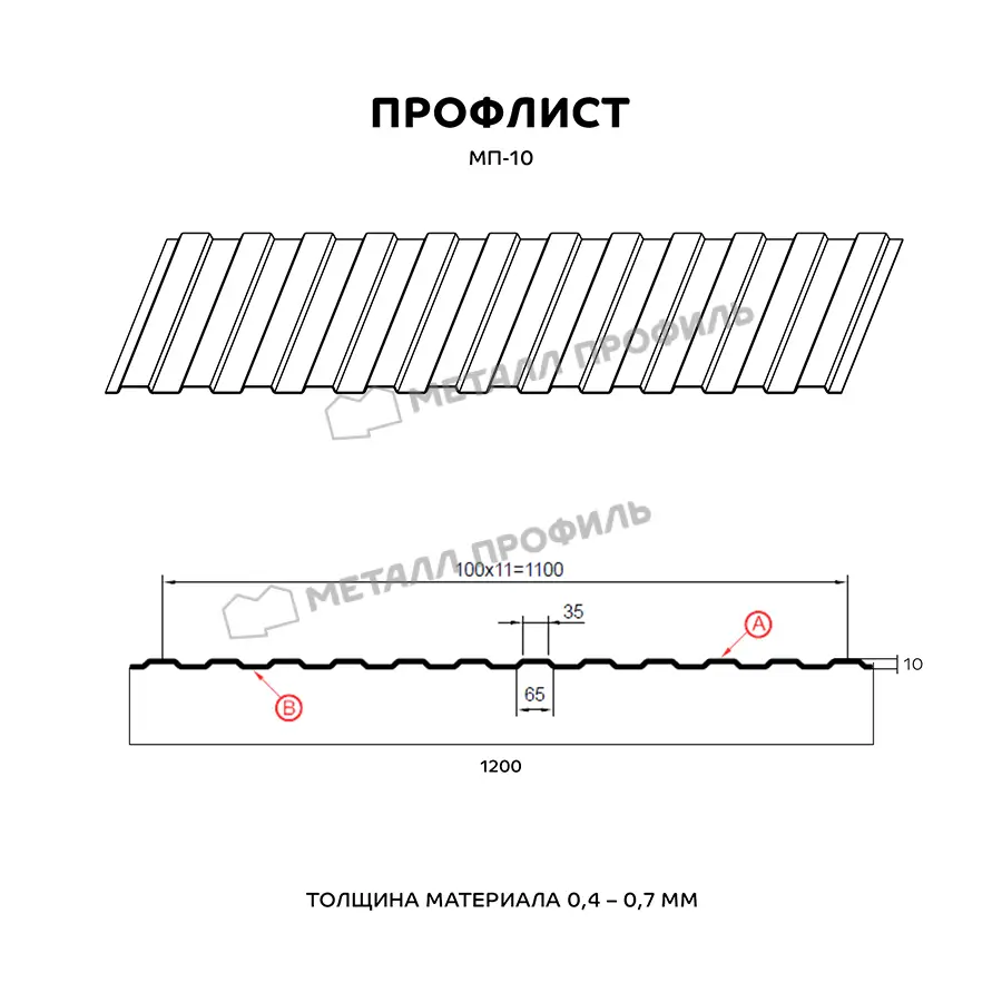 МП-10 – один из традиционных типов стенового профлиста. Он замечательно подходит в виде стенового материала, подвесного потолка в нежилых зданиях, вентилируемого фасада, забора, декоративного ограждения. Профиль обладает трапециевидной формой волны, одинаковой на сторонах А и В. Глубина трапеции – 10 мм, это не обеспечивает металлопрокату высокой несущей способности, но при оформлении стен это не столь важно. Но зато минимальный рельеф поверхности не создаёт зданию индустриальный облик. На прочностные качества можно воздействовать, выбрав различную толщину металла. Этот профиль выпускается в вариациях от 0,4 до 0,7 мм. Увеличить антикоррозионную защиту позволит защитный полимерный слой. Он не только обладает богатым цветом, устойчивым к выгоранию под ультрафиолетом, но и предотвратит мелкие механические повреждения и корродирование стальной основы.