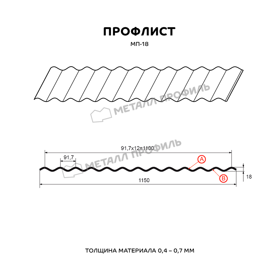 Профнастил МП-18 выделяется на фоне прочих марок этого стройматериала необычной формой волны. Это уникальной профиль с закруглёнными изгибами. Волнистый вид гофры делает этот профиль подходящим материалом для вентилируемых фасадов, установки заборов, перегородок в индустриальных строениях. Специально для этого профнастила Компания МеталлПрофиль изготавливает угловые элементы округлой формы, которые позволяют оформлять внешние и внутренние углы зданий, придавая им облик в стиле хай-тек. Профиль обладает средней высотой 18 мм и довольно приличной полезной шириной проката – 1100 мм. МП-18 прокатывается из оцинкованной стали толщиной от 0,4 до 0,7 мм. А добавление защитного слоя не только улучшает внешний вид готового изделия, но и повышает устойчивость профлиста к появлению ржавчины, а значит, увеличивает срок службы. Все эти параметры делают МП-18 стильным и выгодным стройматериалом с низкой стоимостью владения.