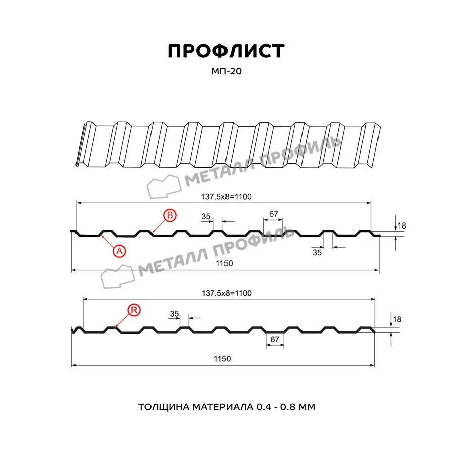 Один из востребованных в Копорье профилей с небольшой глубиной волны – 18 мм. Указанная в названии маркировка 20 – на самом деле просто округлённое число точного размера. Широкий выбор толщин, в которых изготавливается МП-20, а также его технические параметры дают возможность применять МП-20 в самых различных областях. Металлопрокат 0,35-0,4 мм хорош для обшивки внешних стен, поскольку не несёт никакой нагрузки. В данном случае важен небольшой вес и защитное покрытие, определяющее оттенок и фактуру изделия. Для обустройства крыши лучше брать профнастил с толщиной от 0,5 мм – он прочностью, чтобы противостоять снежным массам и потокам воды. Для возведения ограды наилучшим выбором будет профлист толщиной 0,4-0,5 мм. Более толстый профиль применяется уже в роли внутренних переборок в нежилых помещениях, для создания каркасных конструкций (гаражей, павильонов, киосков).